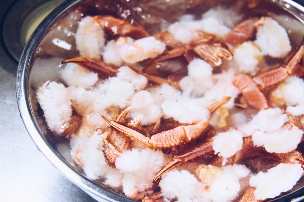 川股さんの妻・みち子さんに教えてもらいながら、毛蟹を一人一匹解体してみます。鮮度の良い毛蟹は、殻をむいて水に晒すとふわっと身が花開くように広がるのが特徴。抜群の鮮度の毛蟹はお刺身でいただきます。