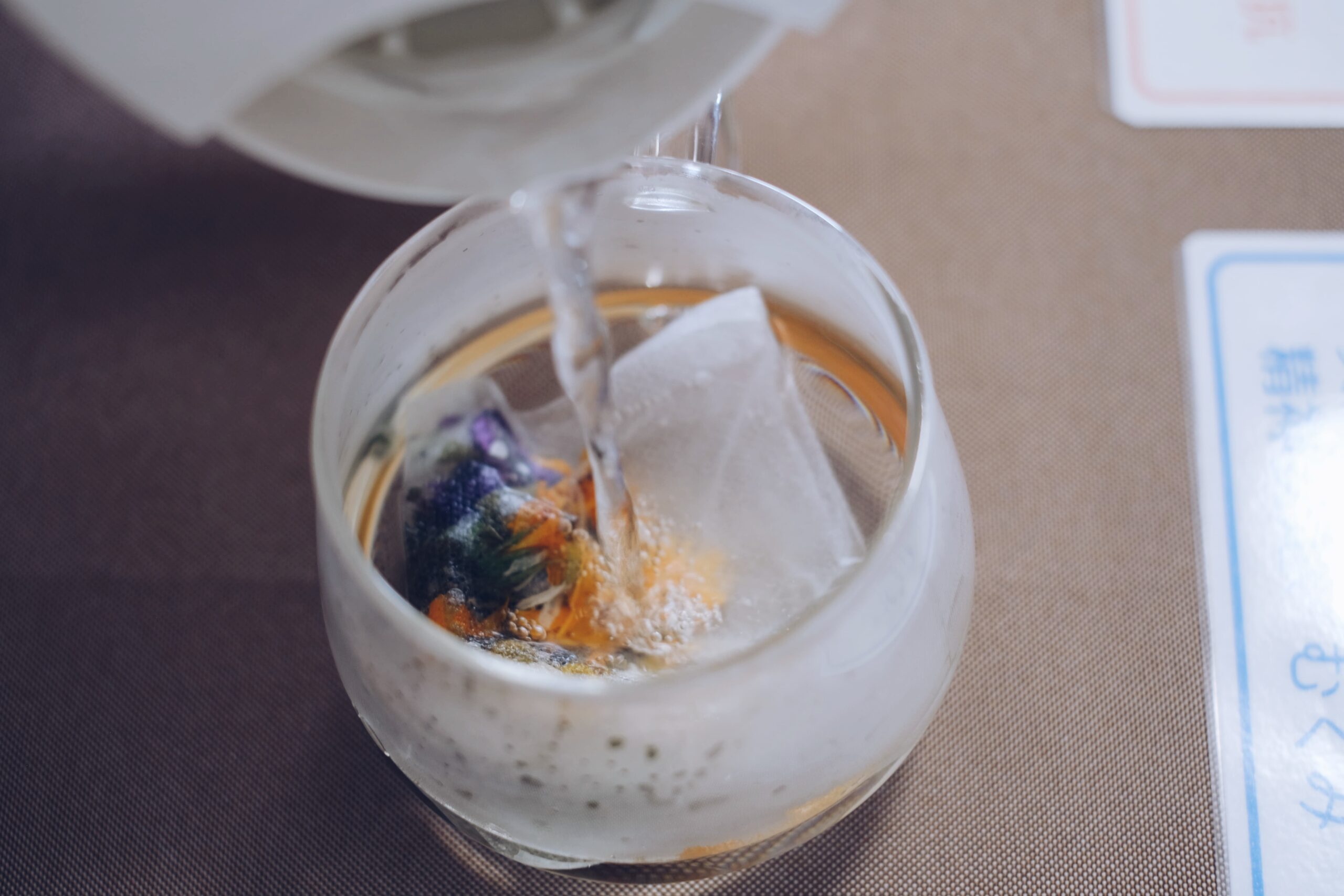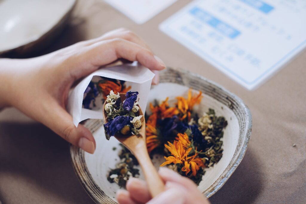 畑から移動して日向さんのご自宅へ。日向さんの畑で収穫された薬草を使って、オリジナルのハーブティーづくりを体験します。効用で選ぶもよし、香りで選ぶもよし。日向さんから教えてもらいながら世界に一つだけのブレンドティーをつくりましょう。