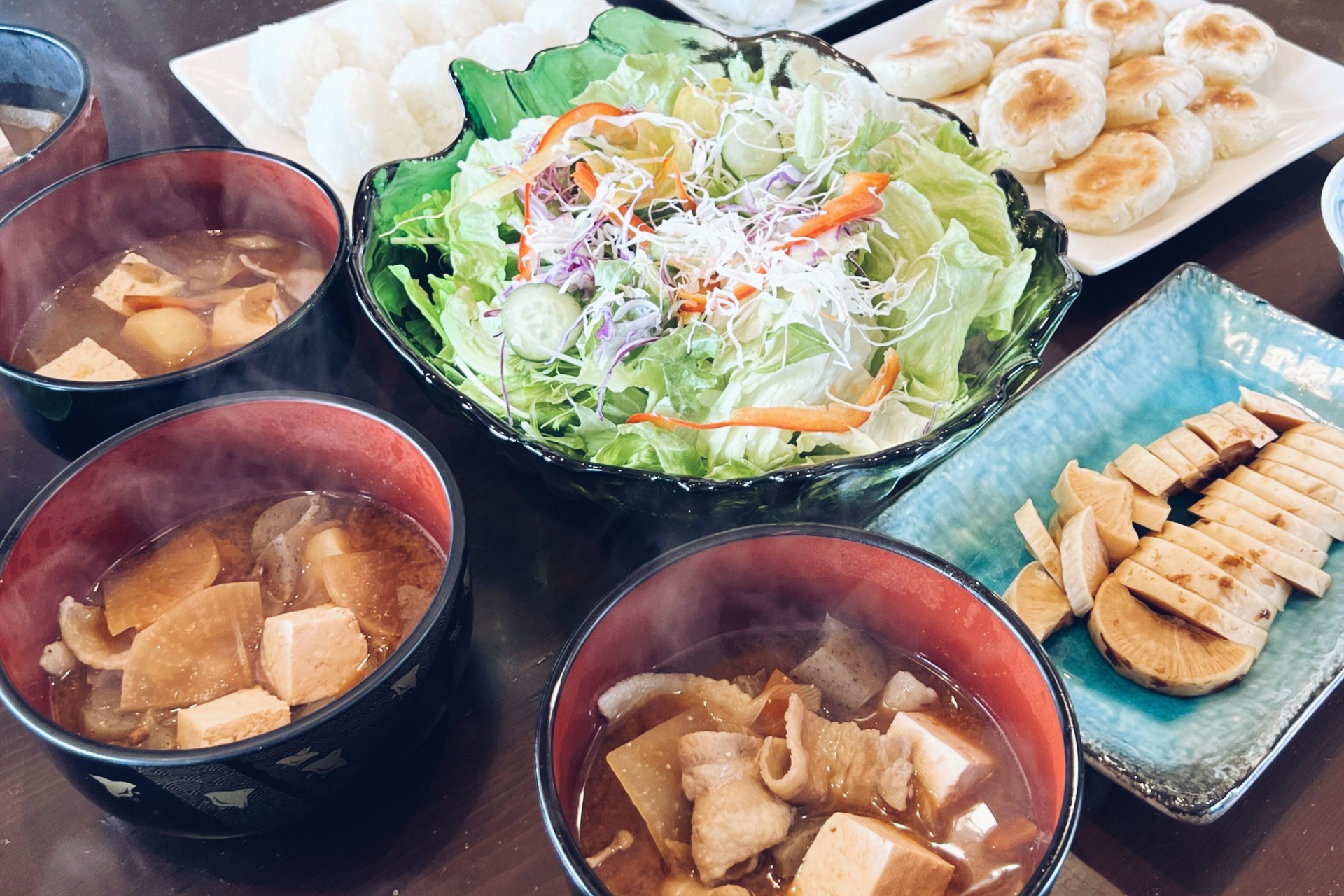 味噌を作った後は、農家めしづくり。北海道の郷土料理である「いもだんご」をつくり、とやま農場の味噌で作ったお味噌汁やおにぎりと一緒にいただきます。みんなで食卓を囲んでの団らんも楽しい時間です。